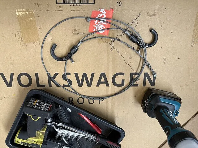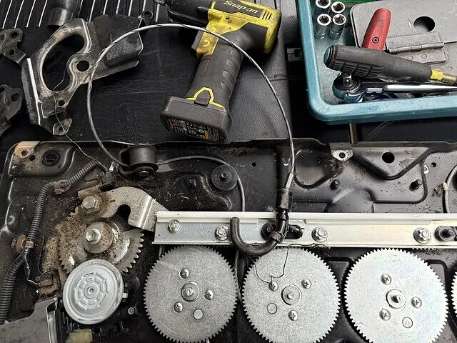 固定装置4箇所のうち、真ん中の固定装置のワイヤーがほつれていてギアに絡まり動かなくなっているので交換作業に入ります
